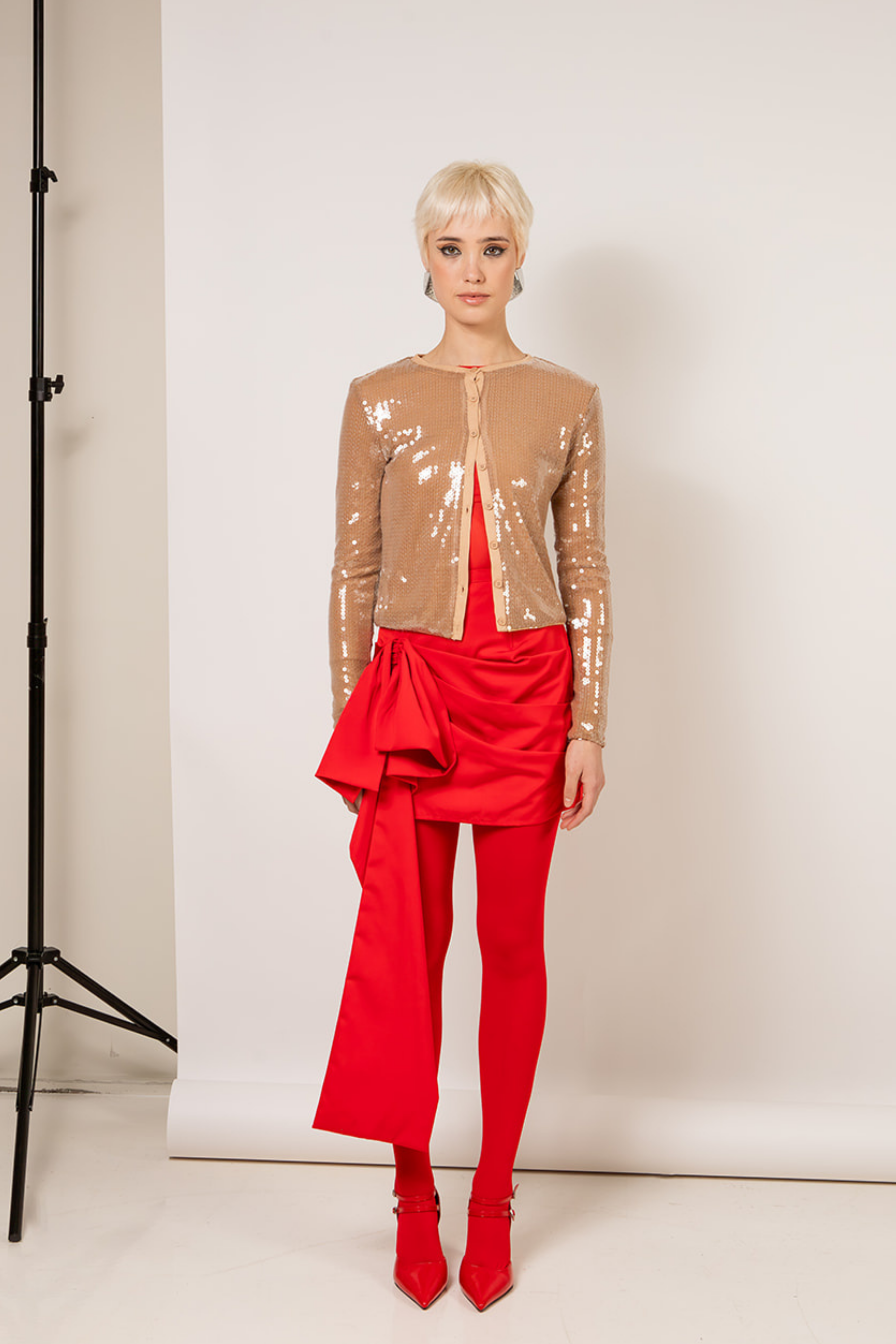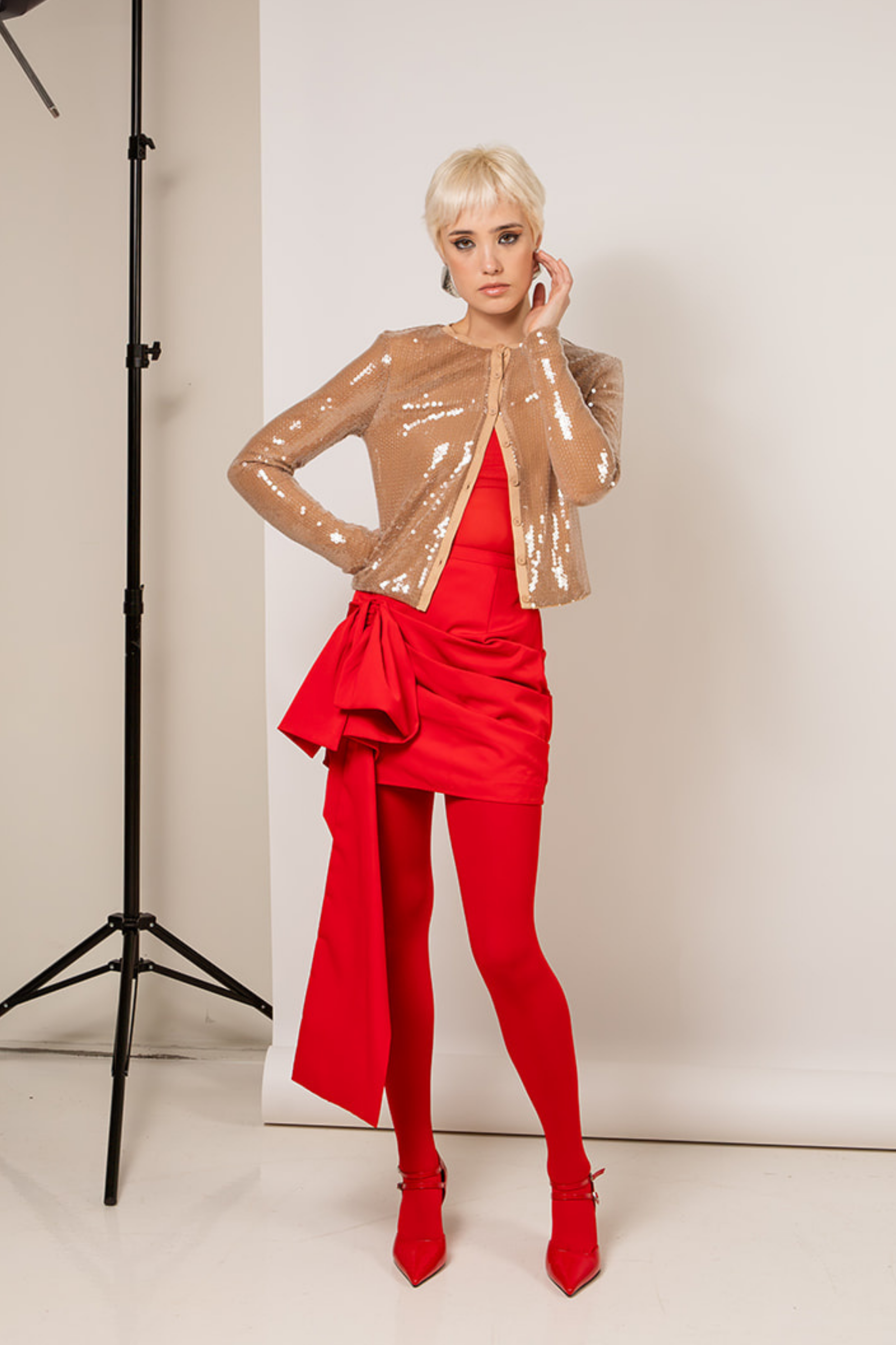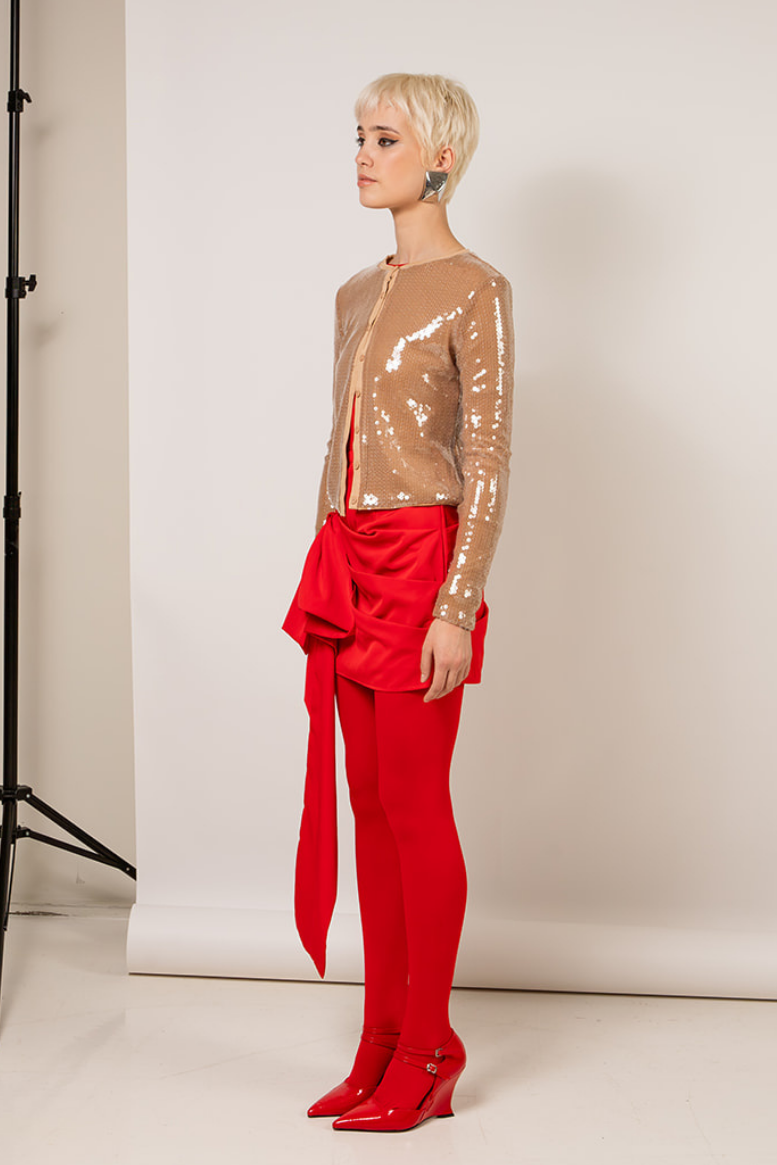 This is a delicate fabric which requires additional care. Choose accessories carefully to avoid snagging. Due to the nature of this fabric, sequins may fall off with wear.