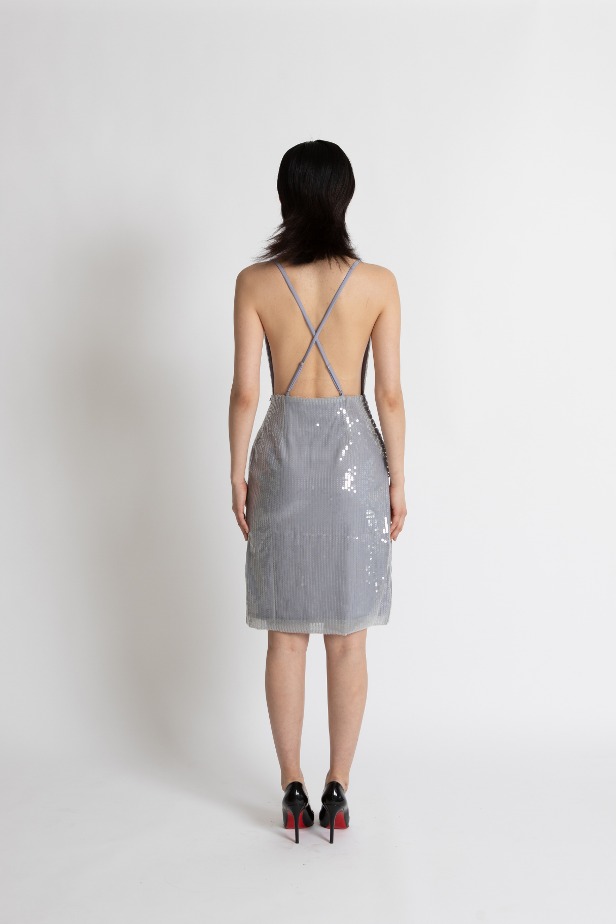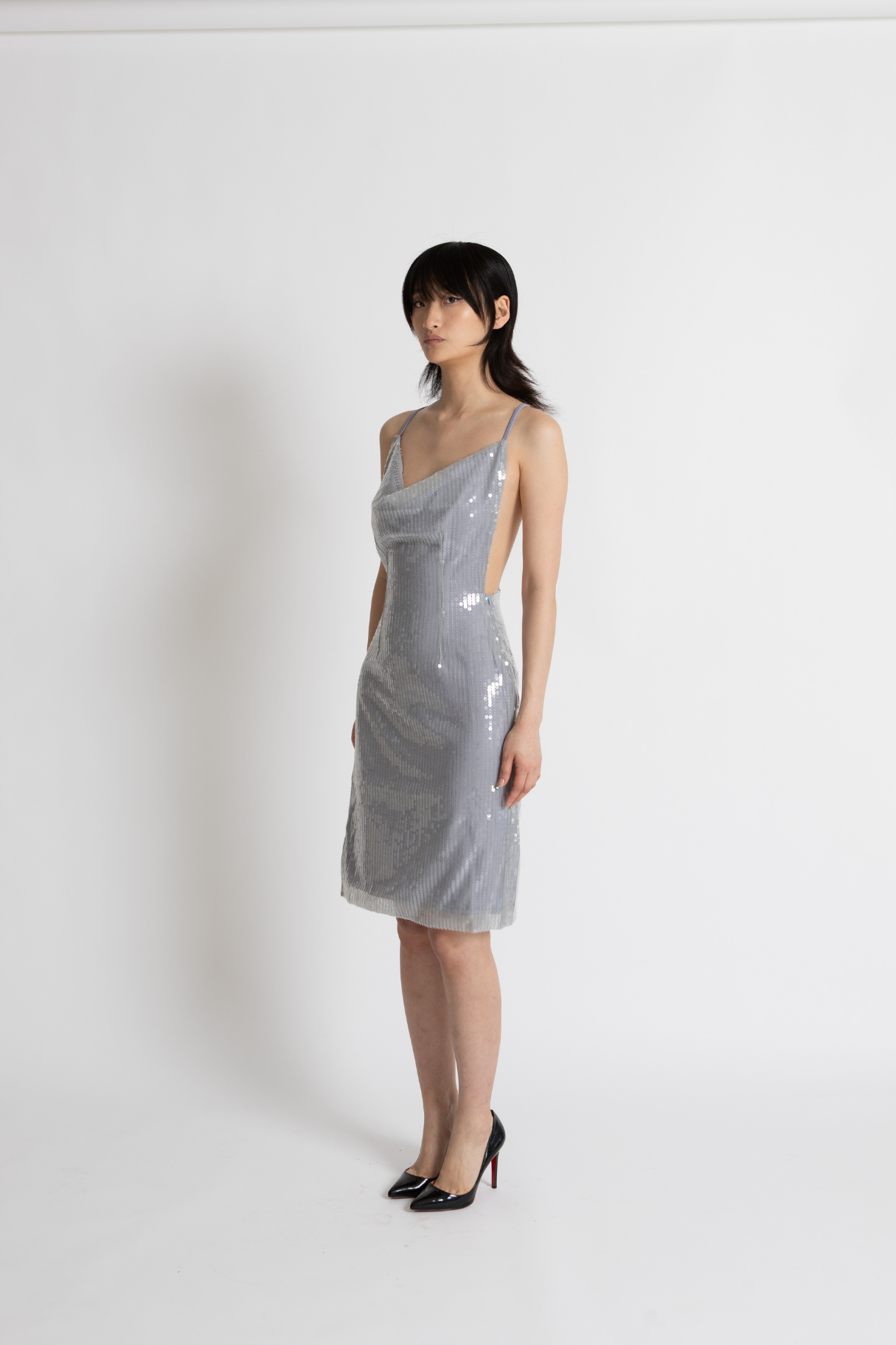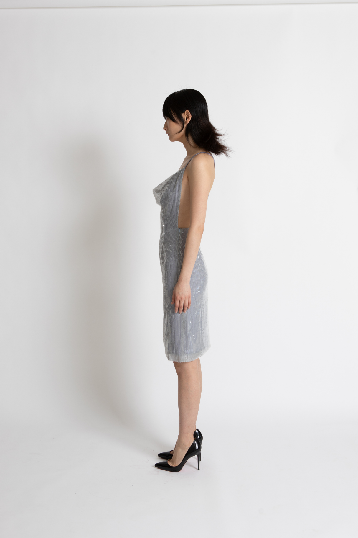 The Harper dress is crafted with luxurious grey mesh and embroidered with clear sequins for a glamorous look. It features a cowl neckline and open back with adjustable straps in lavender jersey, and a high slit with functional buttons In lavender jersey. You are able to control the height of the slit with the jersey covered buttons giving you multiple ways to wear the Whisstler Harper dress.