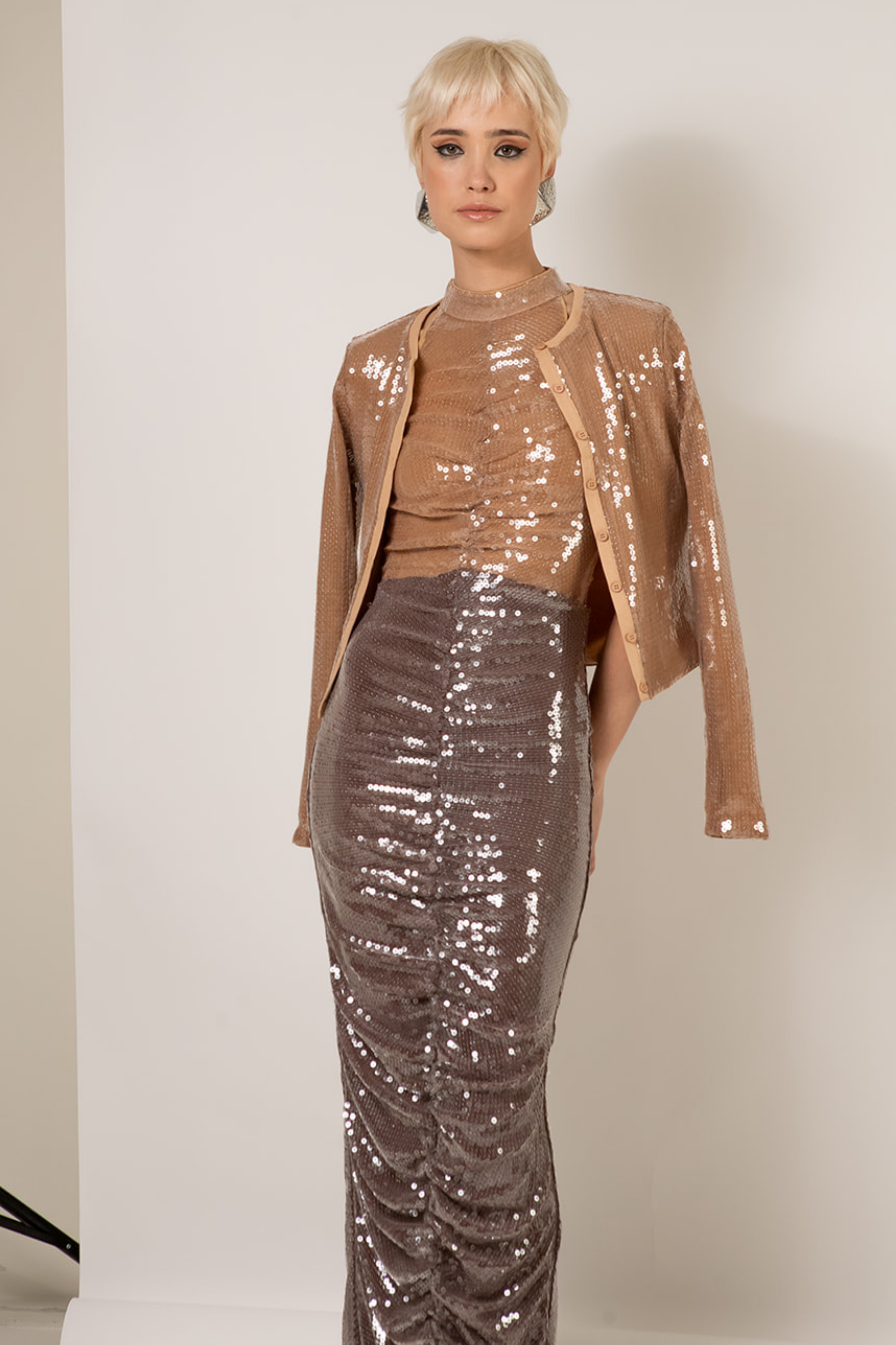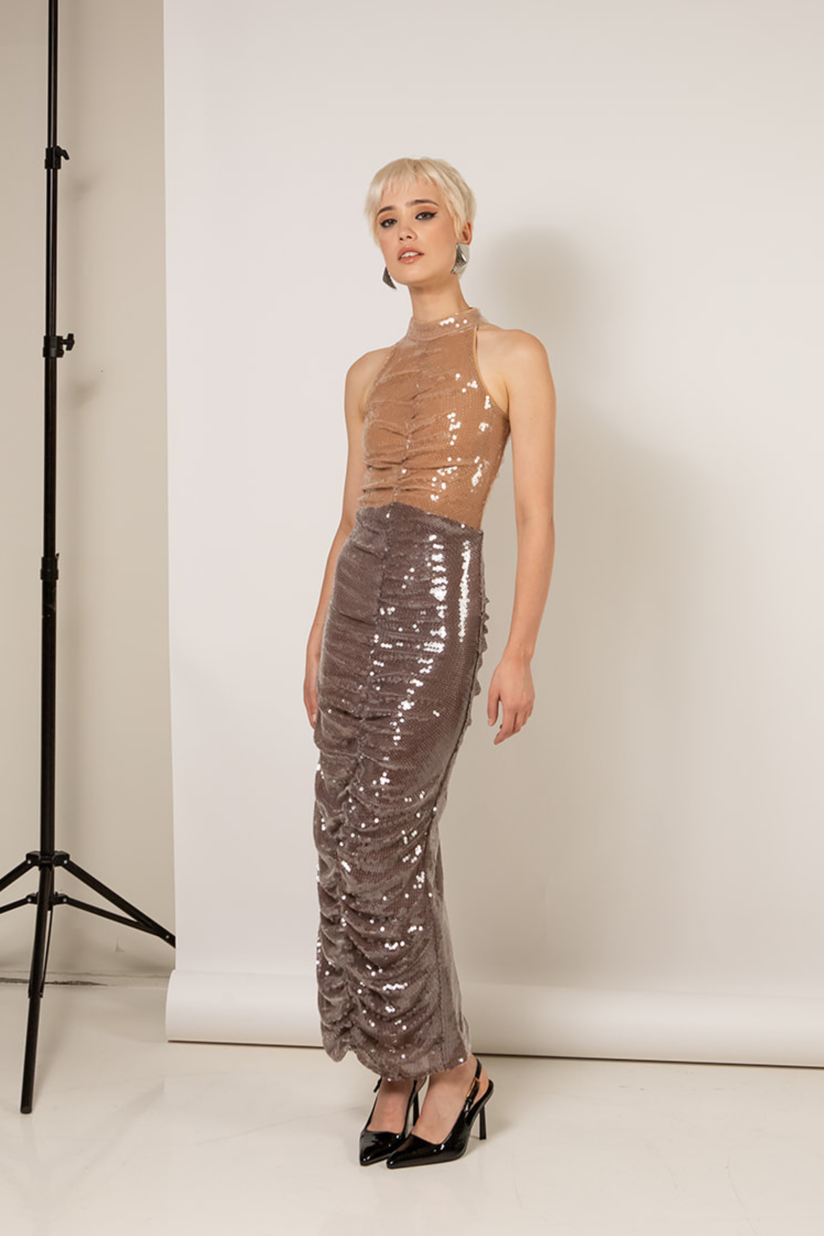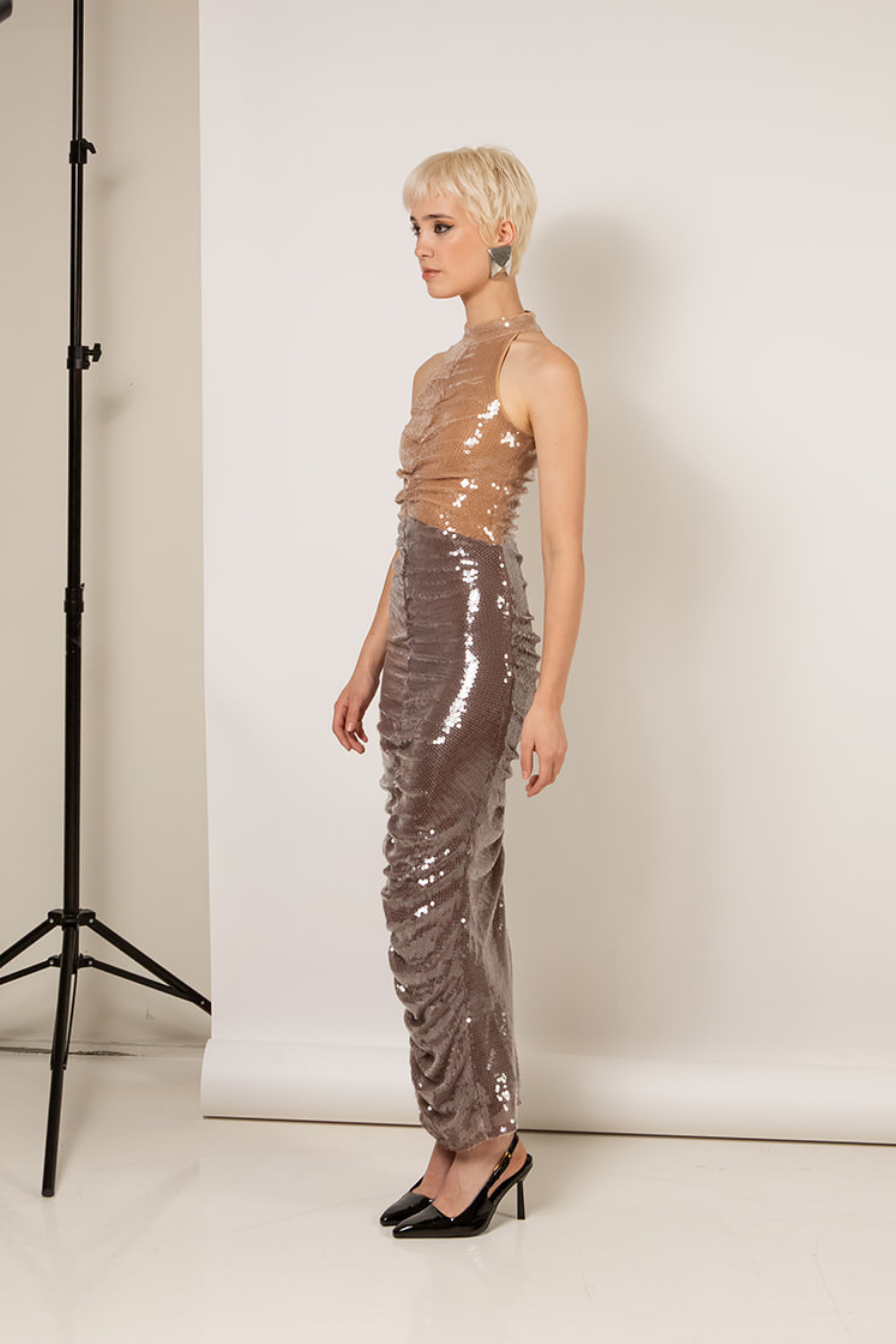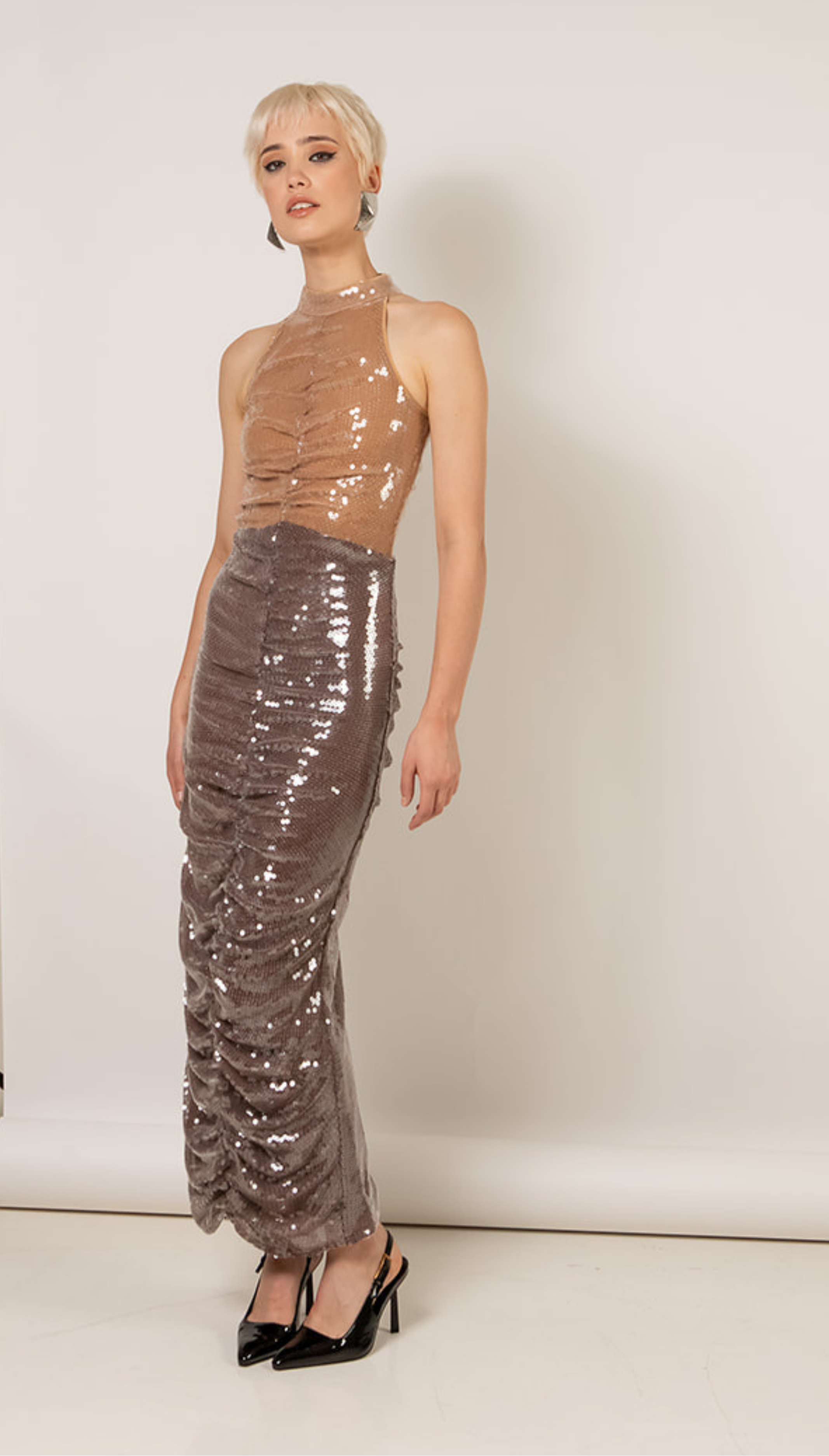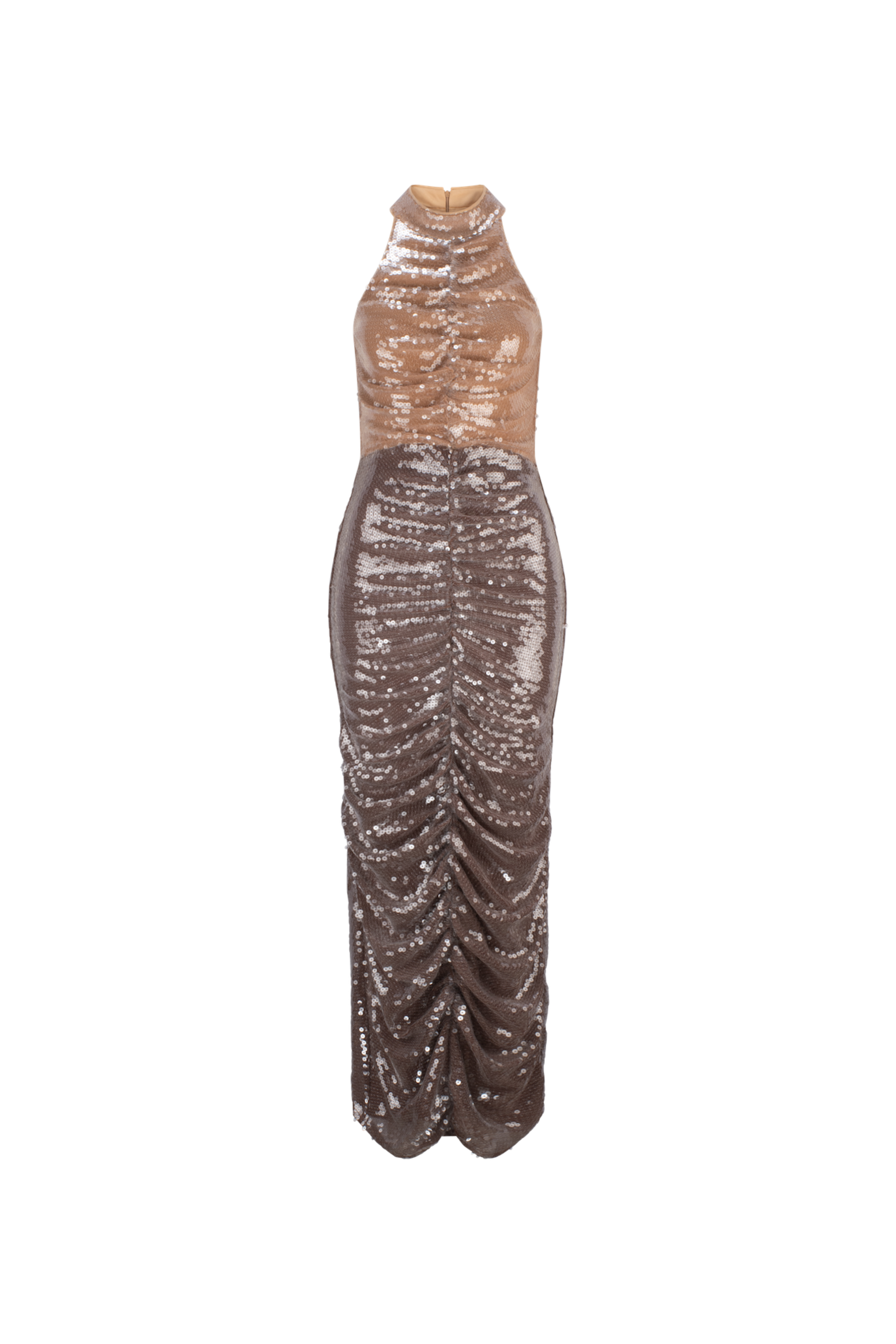 The Two Toned Jade Sequin Dress Is Draped With Whisstler Signature Mesh Fabric and Embroidered With Clear Sequins For A Glossy Wet Look. Designed With A High Neckline And Racer Back, The Jade Sequin Dress Features A Draped Silhouette With 2 Shades of Brown Specifically Designed To Flatter Most Skin Tones. Finished With Stretch Jersey Lining.