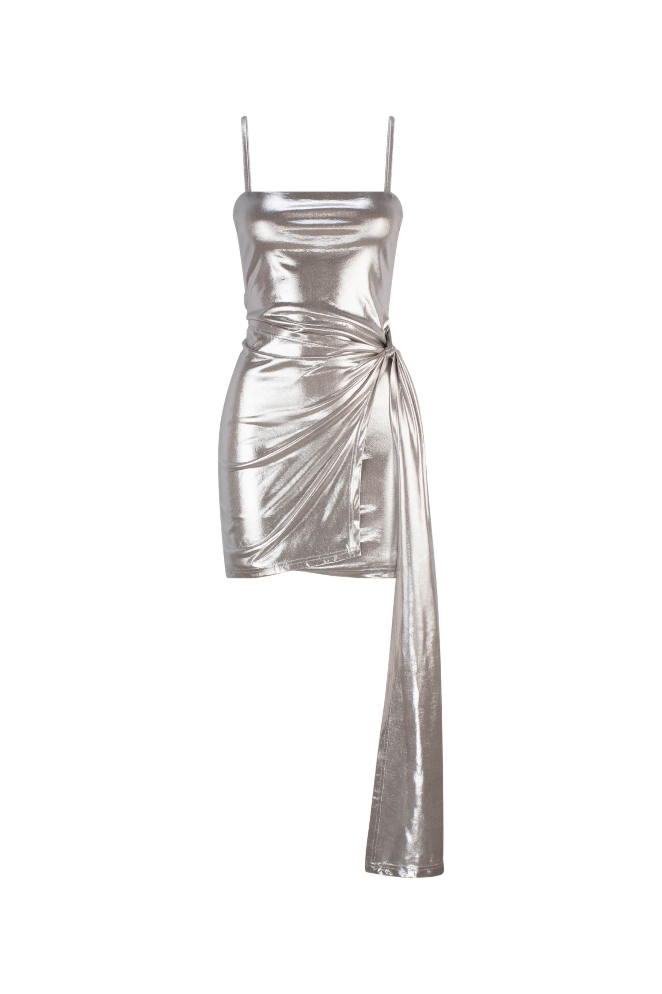 The Jordan Dress Is Draped With Wet Look Stretch Jersey In Metallic Silver. Featuring A Timeless Square Neckline With Adjustable Straps, And Draped Wrap Around The Hips For A Flattering Yet Striking Silhouette. Finished With Stretch Jersey Lining.