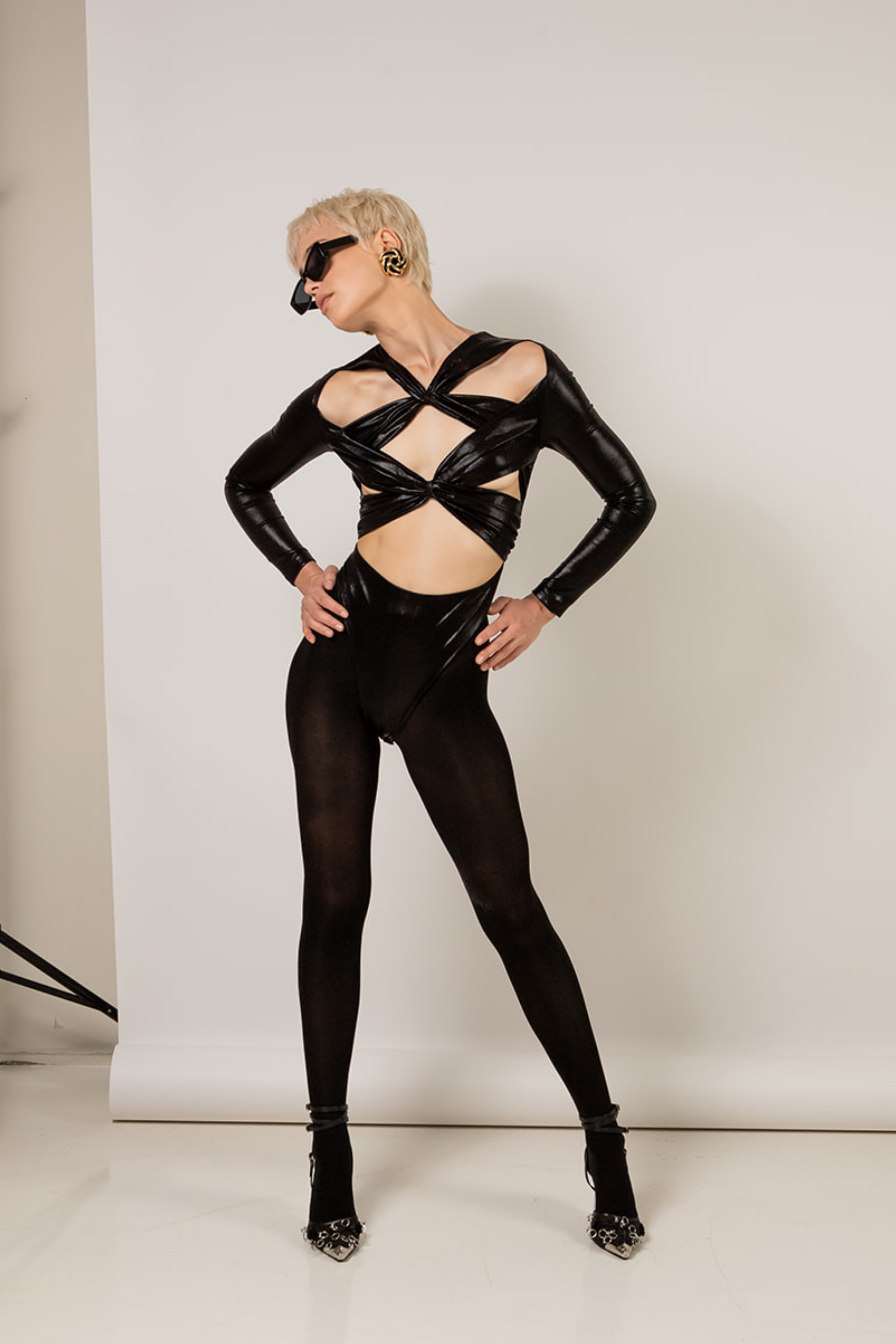 The Julia Bodysuit Is Draped With Luxurious Wet Look Jersey In Metallic Black. Thoughtfully Draped Around The Bust For A Edgy, Sexy Allure. The Julia Bodysuit Features Long Sleeves Lined In Stretch Jersey For Comfort, And A Snap Crotch Closure. Pair It With The Whisstler Yasmin Skirt For A Sophisticated, Edgy Look.