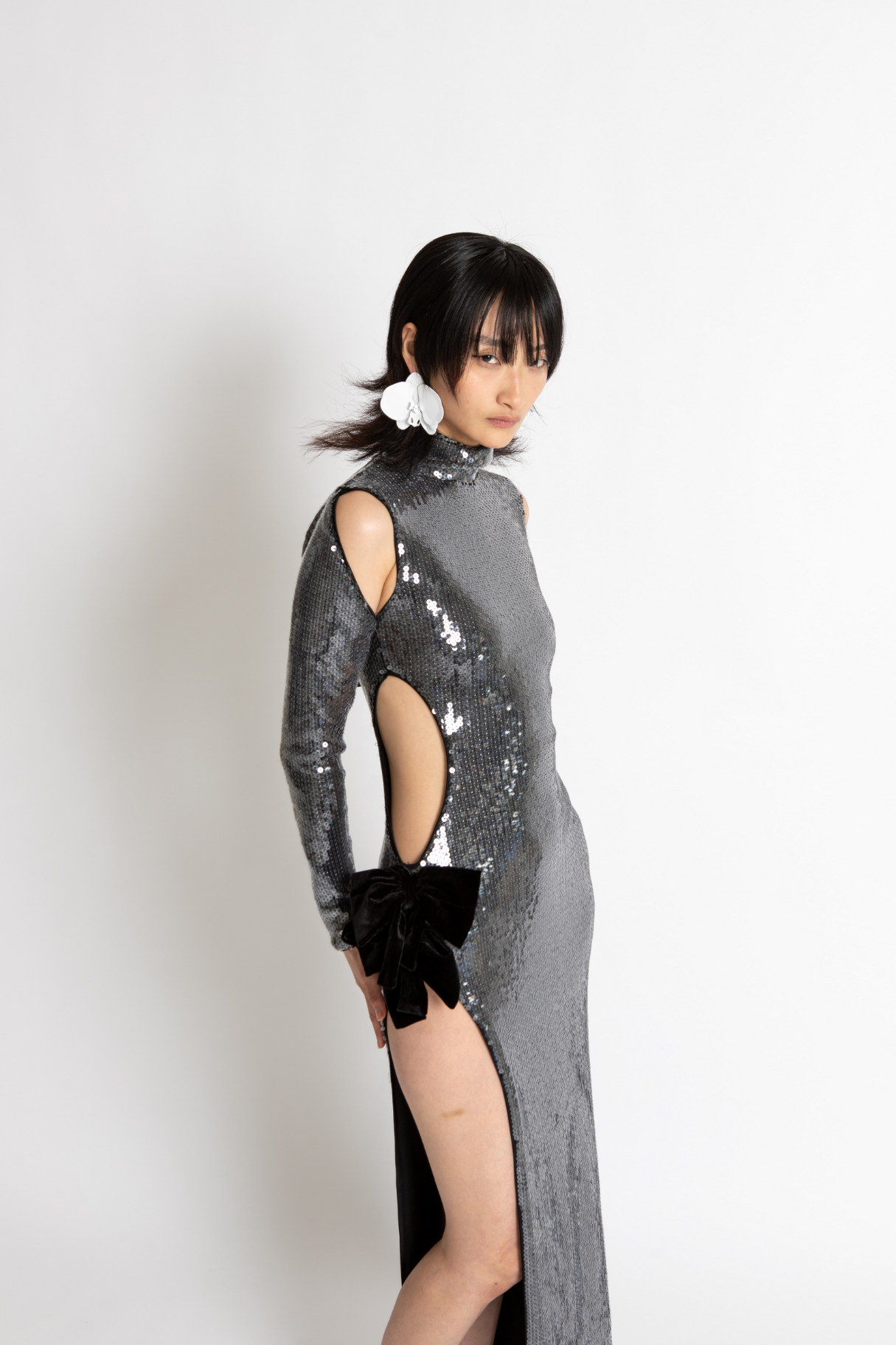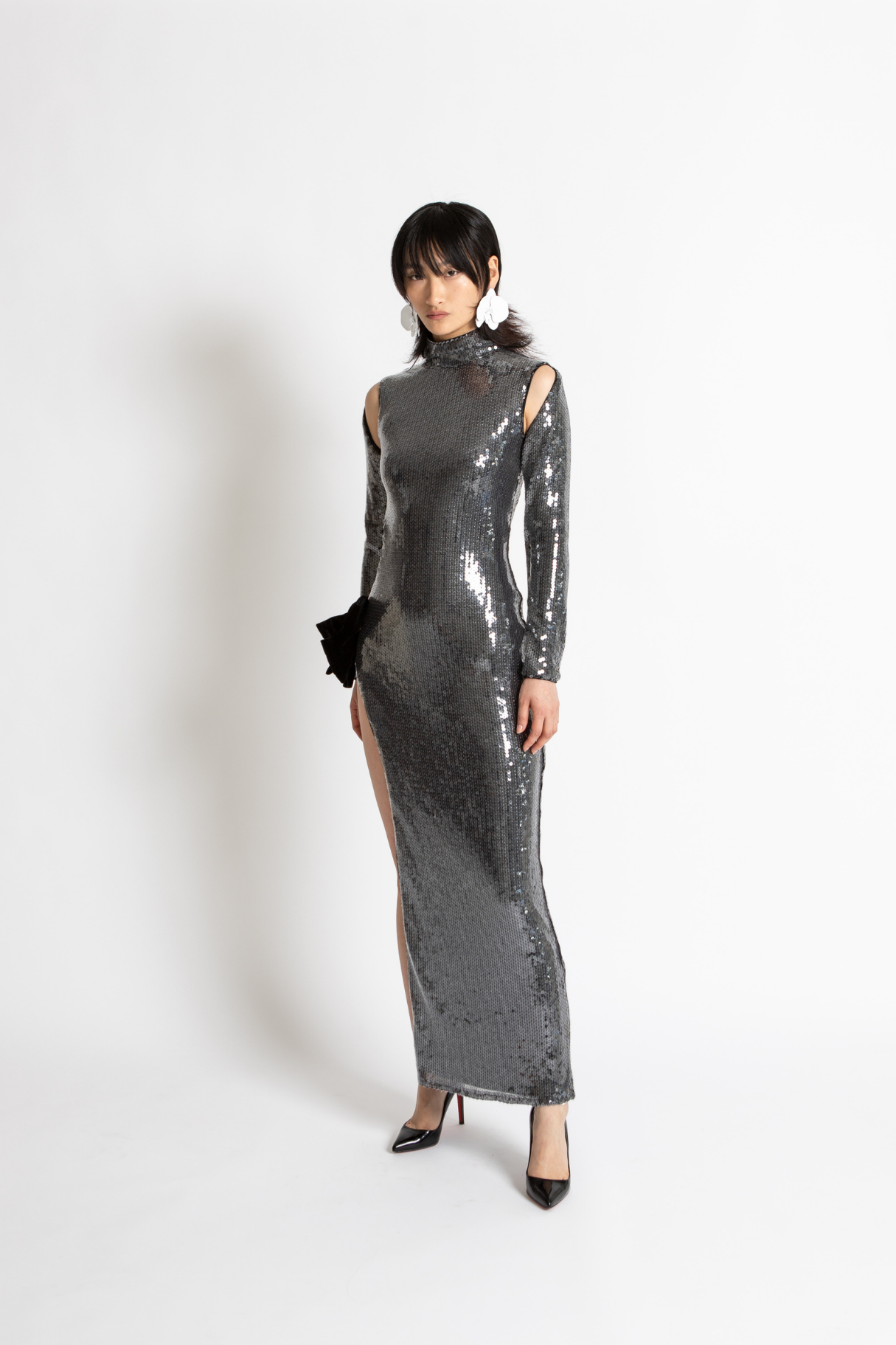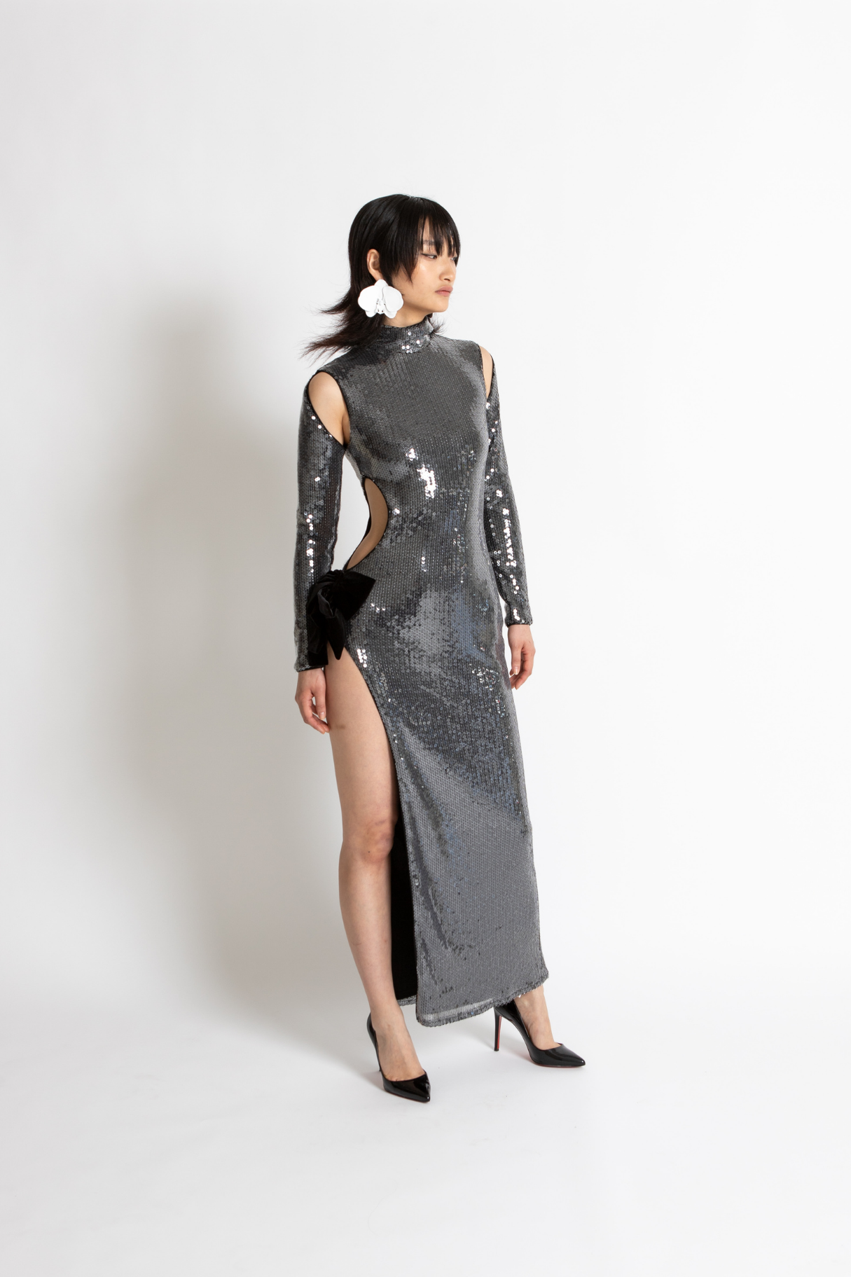 The Kiki Gown Is Crafted From Whisstler Signature Mesh Fabric In Black, Embroidered With Clear Sequins For A Glossy, Wet Look. The Kiki Gown Features Cut Outs At Each Shoulder, A Side Cutout, and High Slit Adorned With Twin Contrasting Velvet Bows In Black. Finished With Stretch Jersey.