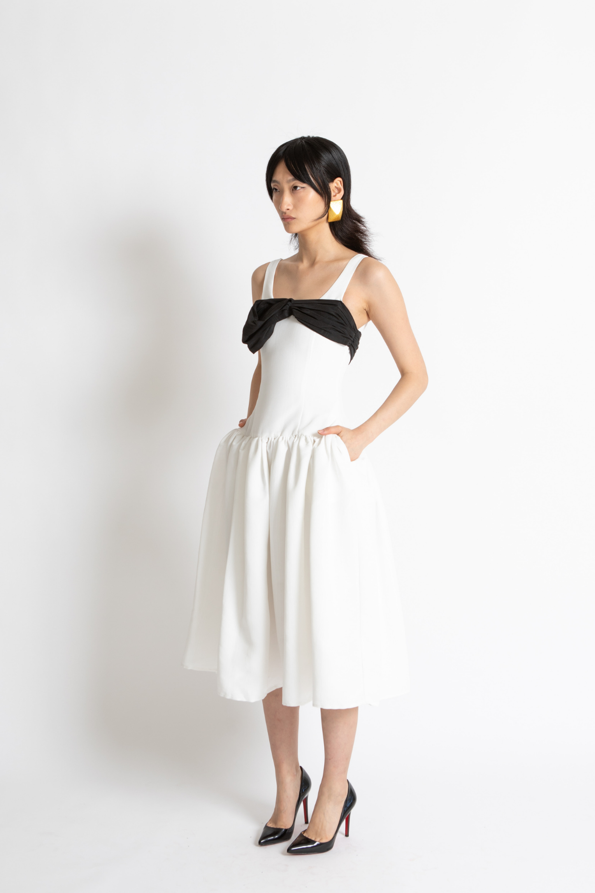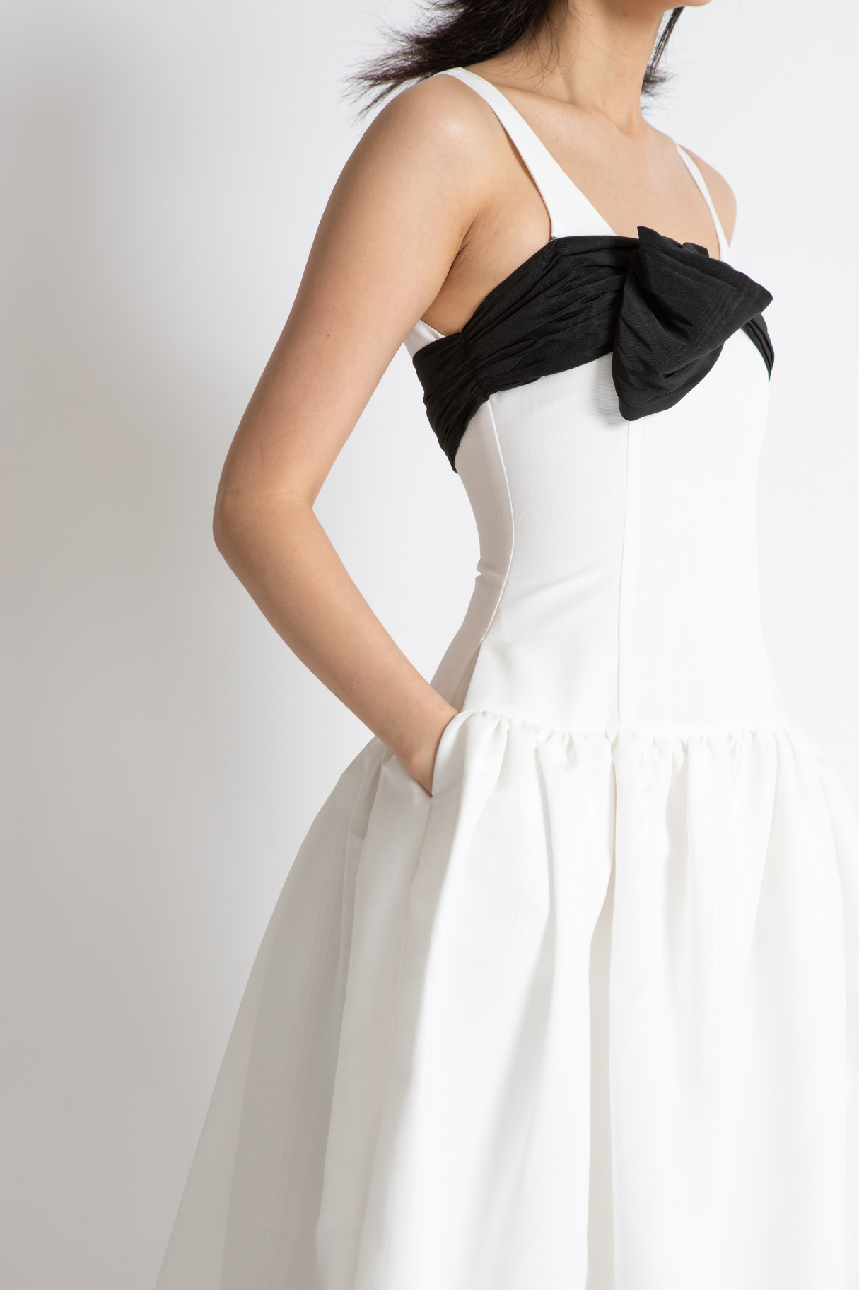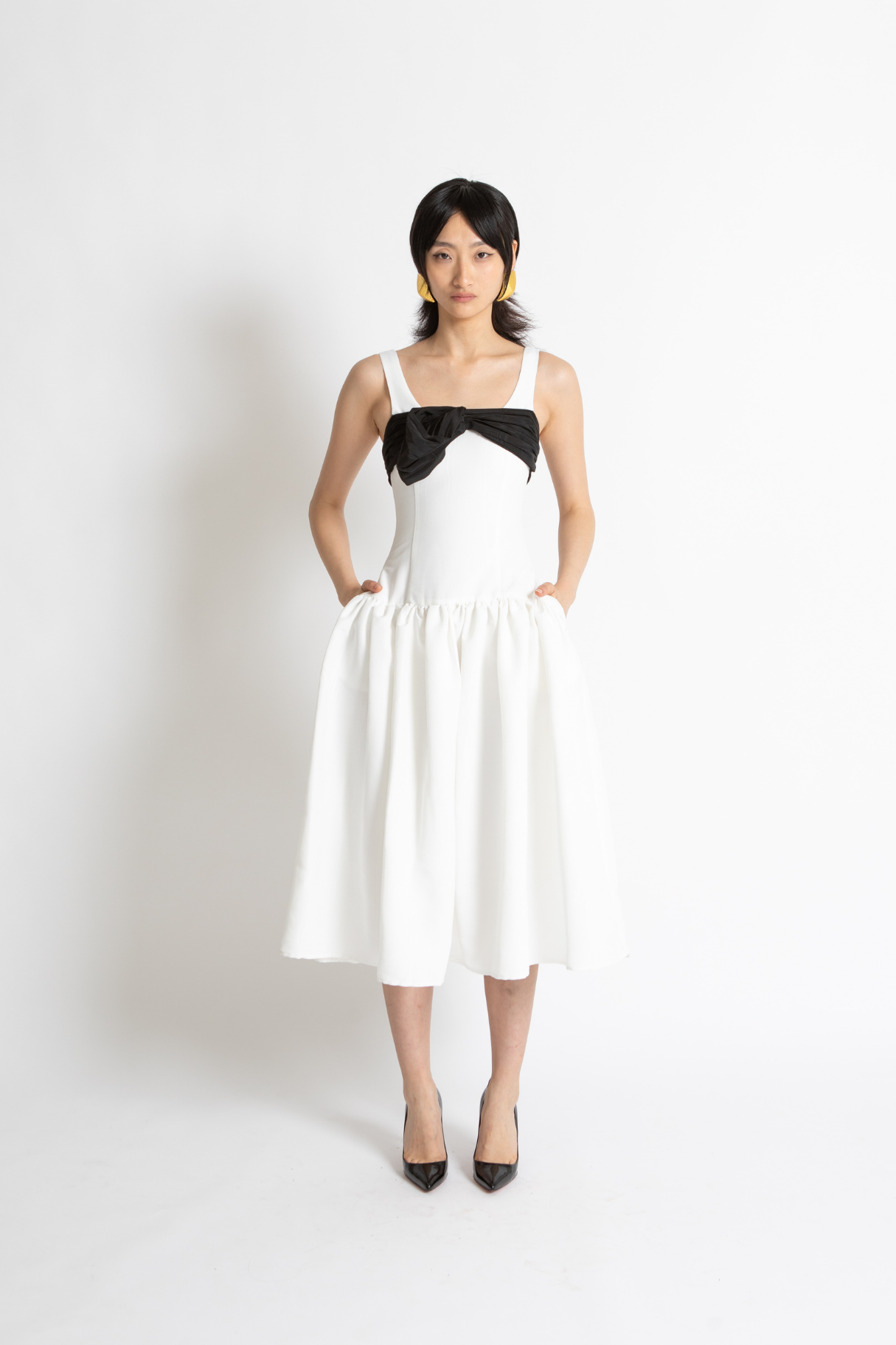The Lucia Dress Features A Drop Waist Tailored Silhouette With Voluminous Full Skirt In Whisstler Signature Grained Twill Fabric. Lucia Features A Dramatic White Silhouette With A Contrasting Black Bow Around The Bust. Thoughtful Details Include Covered Buttons In Satin And Functional Side Pockets.