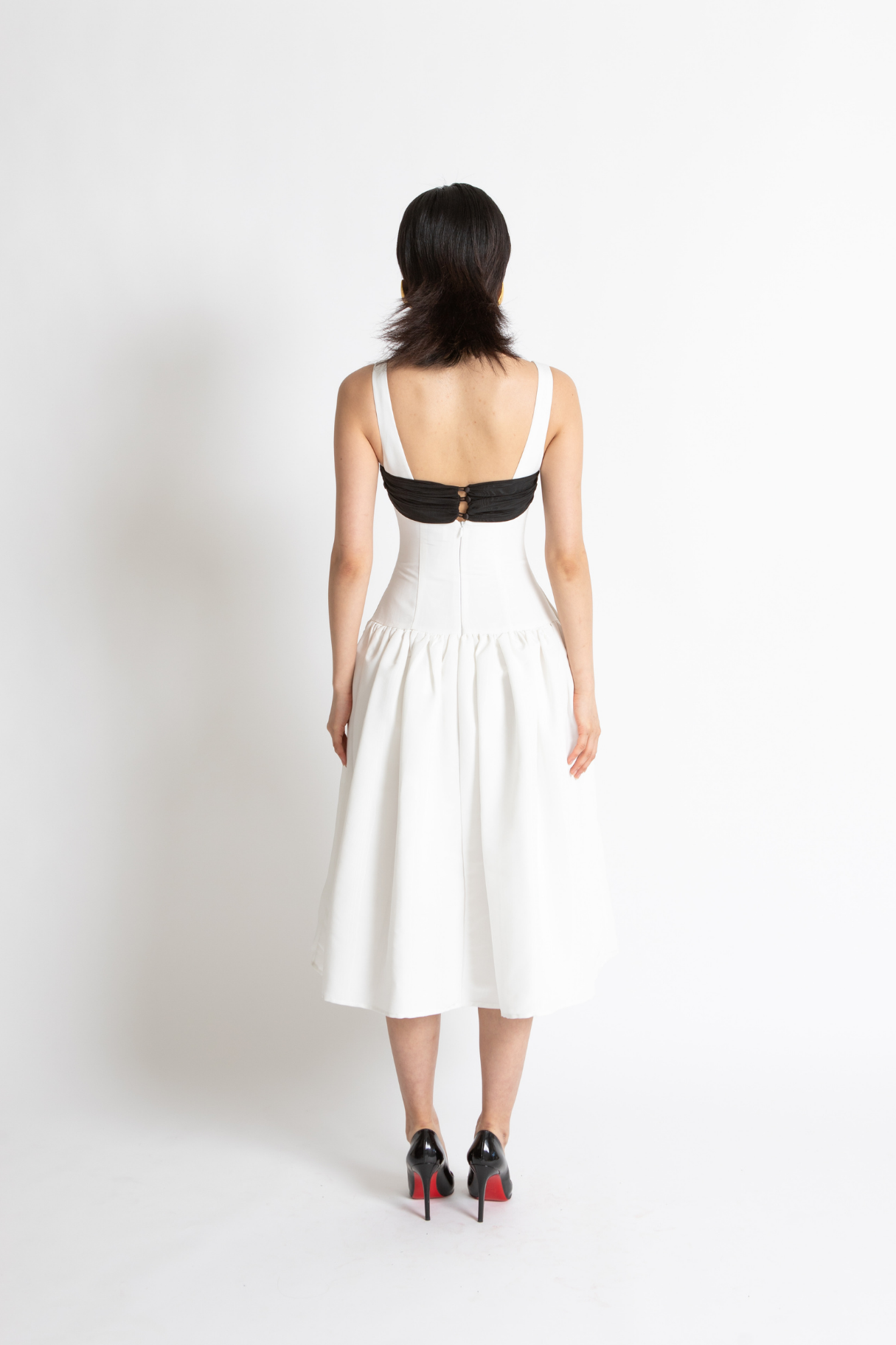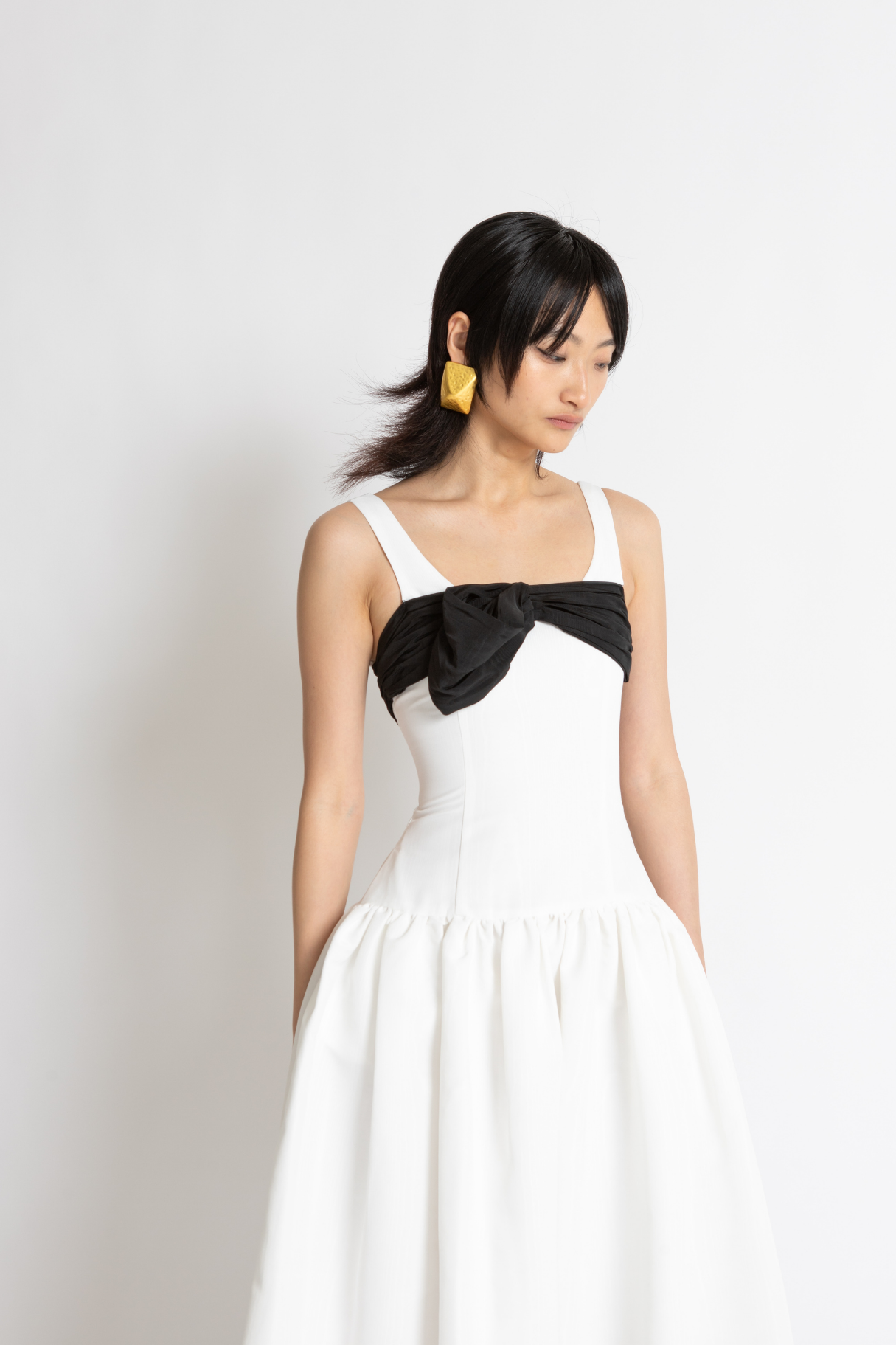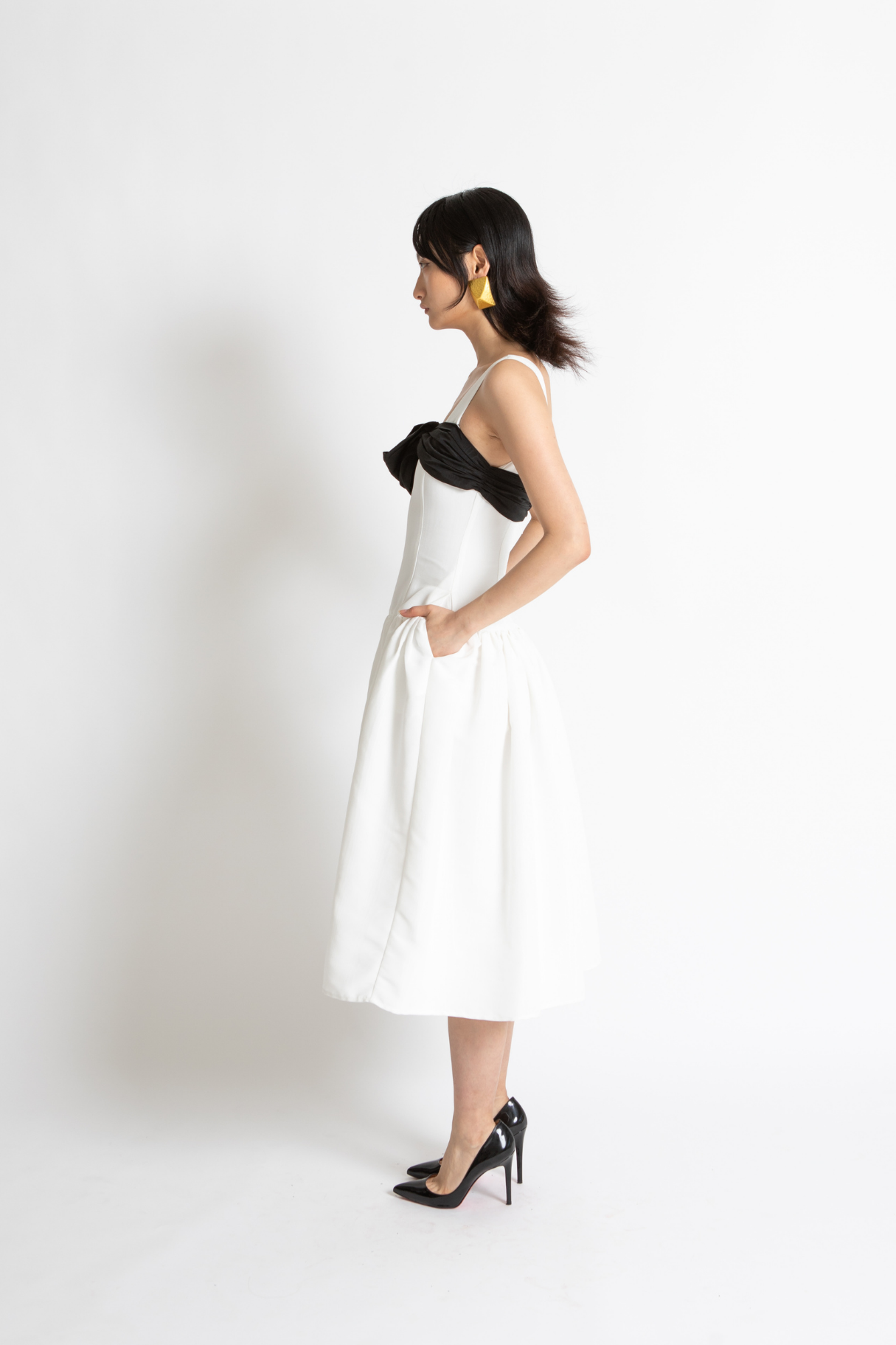 The Lucia Dress Features A Drop Waist Tailored Silhouette With Voluminous Full Skirt In Whisstler Signature Grained Twill Fabric. Lucia Features A Dramatic White Silhouette With A Contrasting Black Bow Around The Bust. Thoughtful Details Include Covered Buttons In Satin And Functional Side Pockets.