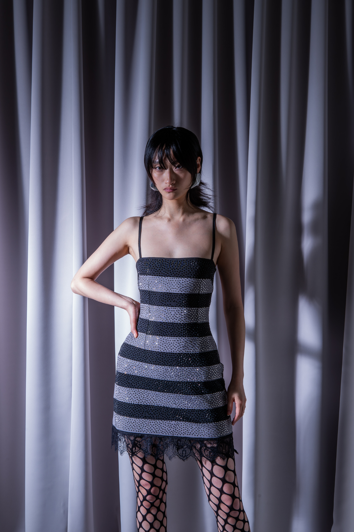 The Stella Dress is constructed with ribbed knit stretch fabric in alternating stripes of black and grey and finished with Swarovski crystals. The Stella dress features a Chantilly lace hem and adjustable straps.