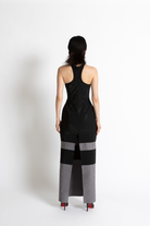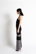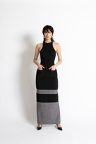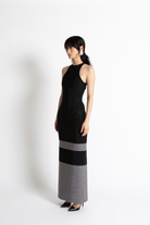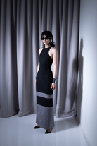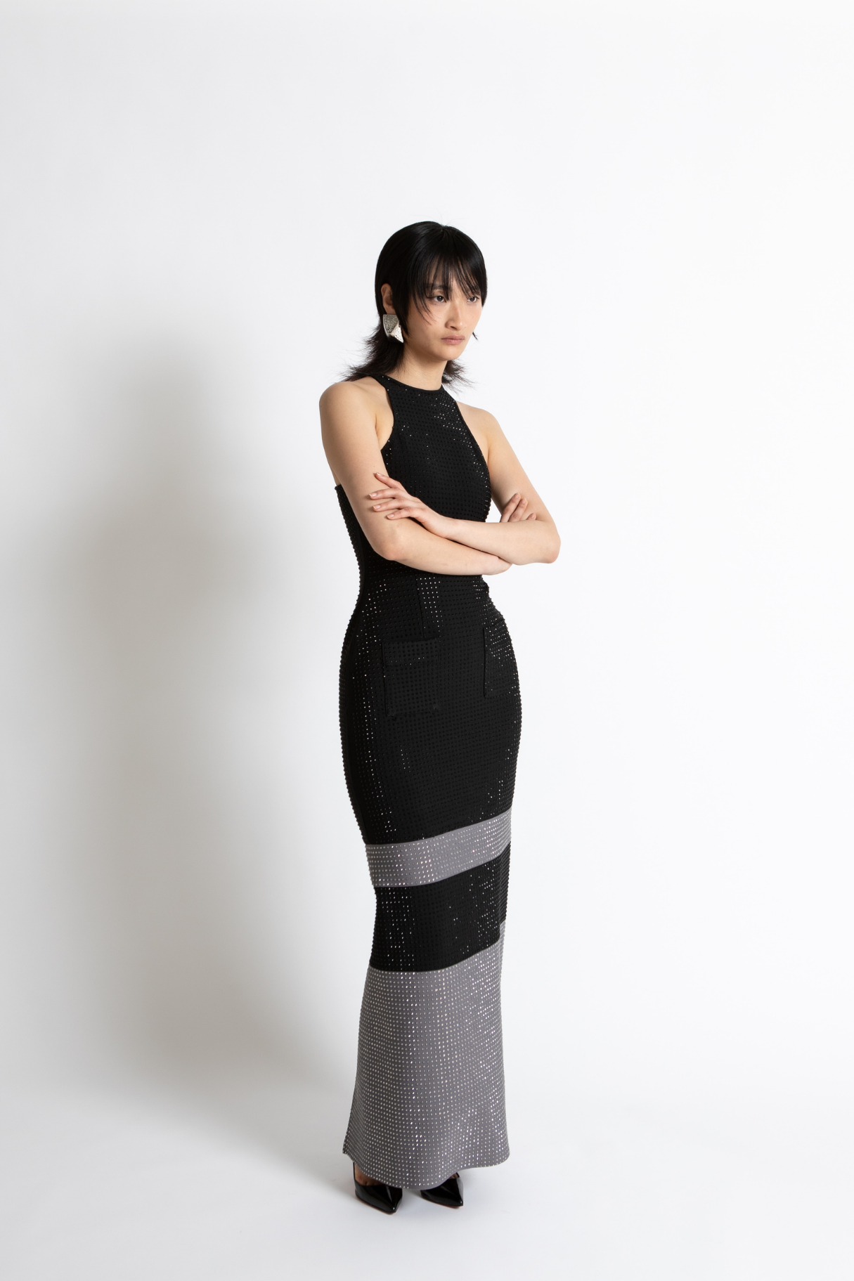 Steal the show in the Whisstler Aria dress. Featuring a high neckline and racer back, the Aria dress is constructed with comfort and style in mind. Draped with ribbed stretch knit fabric in contrasting black and grey, and finished with thousands of Swarovski crystals. The Aria Dress features two functional pockets for convenience, and a high back slit for functionality.
