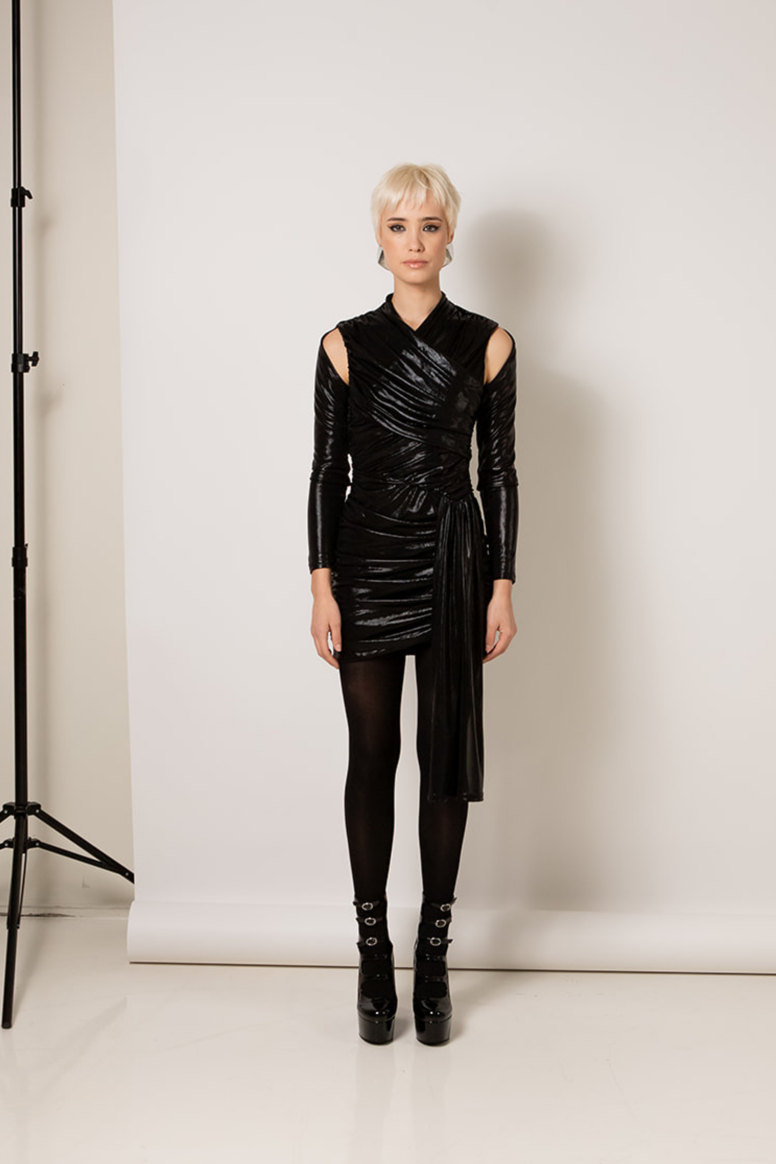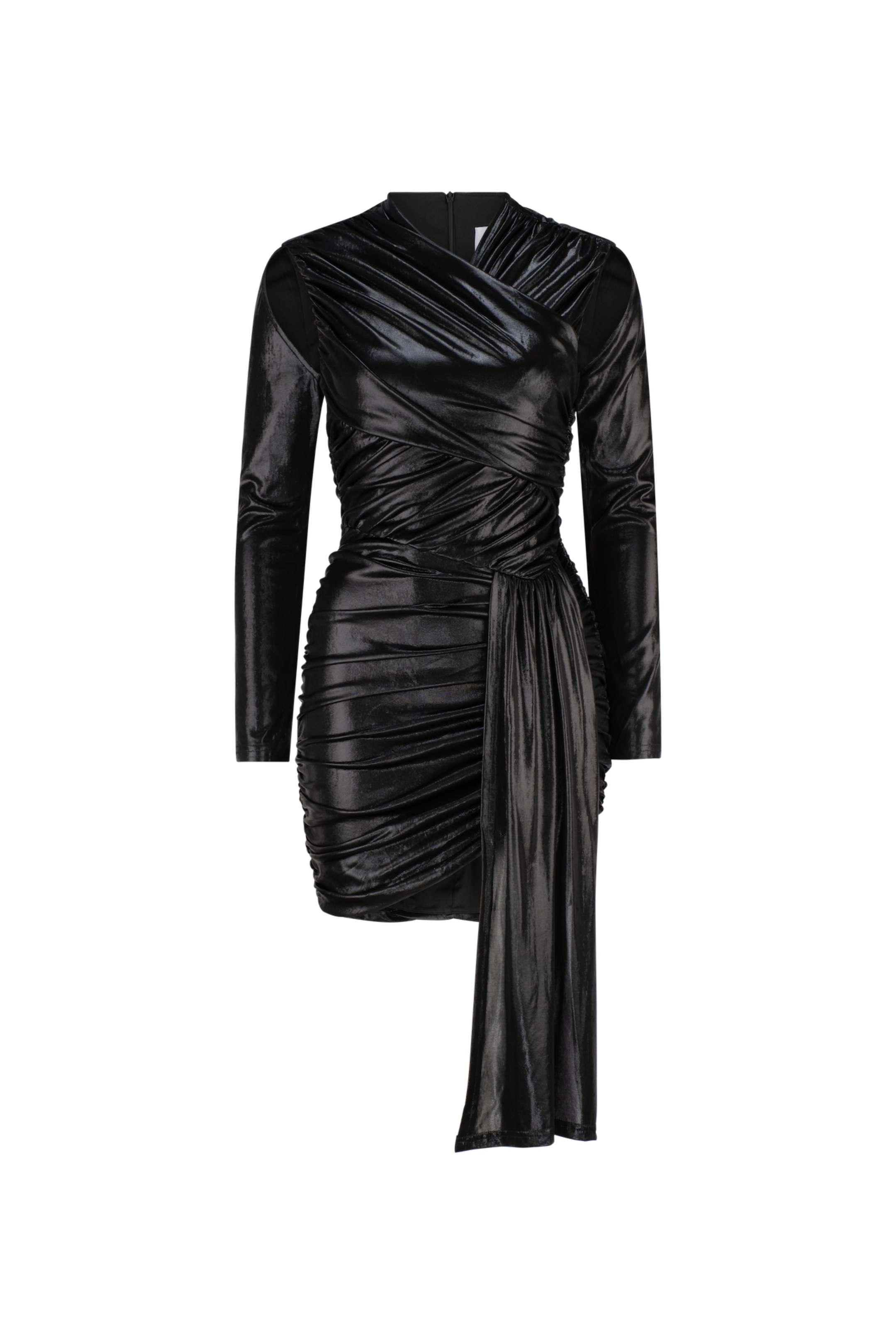 The Iconic Vittoria Dress Is Draped With Wet Look Jersey In Metallic Black. Thoughtfully Draped Around The Body For A Flattering, Edgy Silhouette. The Vittoria Dress Features Shoulder Cut Outs, Long Sleeves Lined In Stretch Jersey And A Dramatic Draped Flair Falling from The Hip.